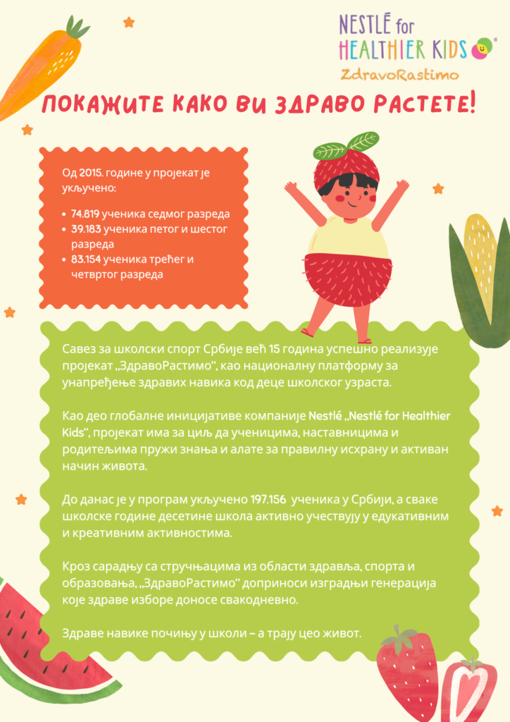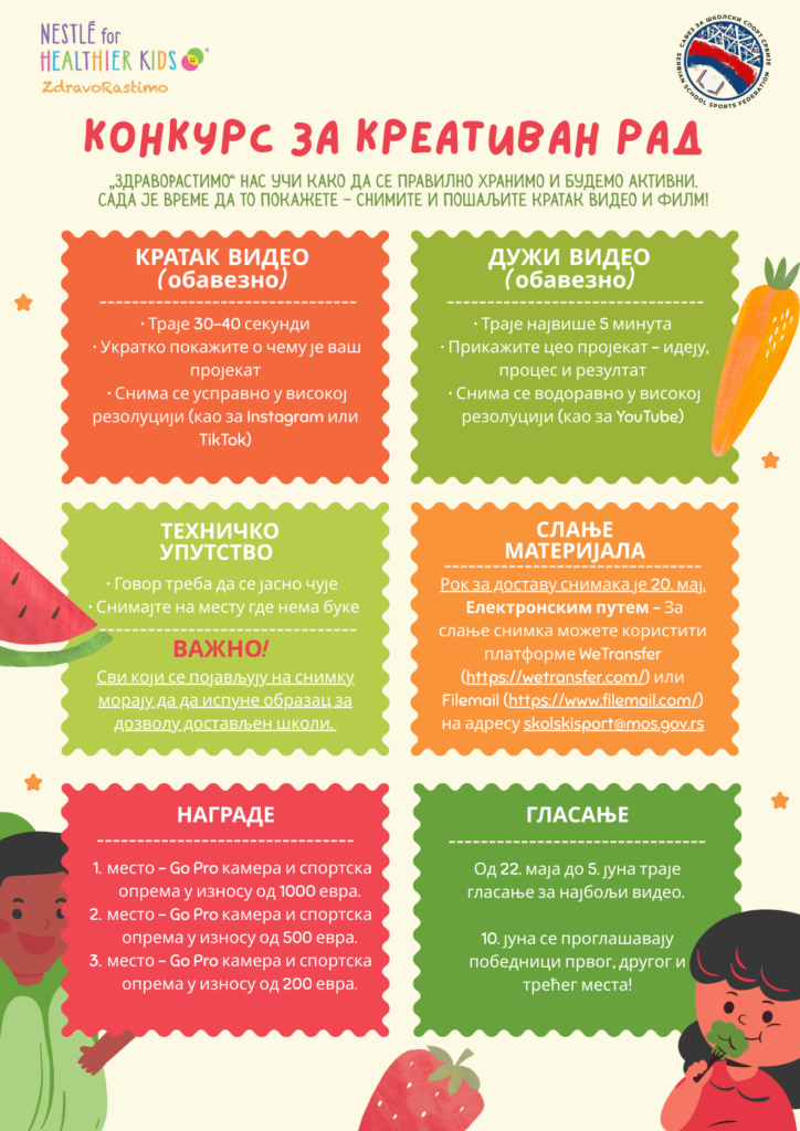 U školskoj 2025/2026. godini kompanija Nestle i Savez za školski sport Srbije raspisujU konkurs za najbolji i najpopularniji kreativni film u okviru projekta Zdravo Rastimo.